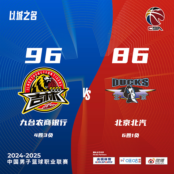 24直播网10月27日讯 CBA常规赛,北京对阵吉林。北京开赛已取得6连胜,周琦继续缺阵。上半场,陈盈骏开场因伤下场,两队短暂相持,北京持续发力取得9分领先,吉林连投带罚迅速追赶,次节双方继续缠斗,得分非常困难,北京全民皆兵,吉林凭借两位外援给出回应,半场战罢北京39-35领先吉林。下半场,琼斯突然发力,单节独得15分帮助吉林确立优势,末节吉林持续发力一度将分差拉开到17分,北京苦苦追赶无果。最终,吉林96-86力克北京,终结对手开赛6连胜。