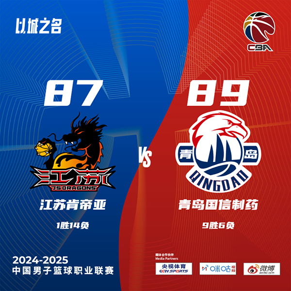 24直播网讯北京时间12月9日讯 CBA常规赛,江苏主场迎战青岛,江苏目前1胜13负排在积分榜第19位,青岛则是8胜6负排名第10,本场比赛青岛外援鲍威尔不打。比赛开始,双方上来十分慢热,随后韦瑟斯庞接连外线发炮连续取分为青岛开局,杰克逊接连杀伤回应,米奇内外线也能得分,青岛首节领先6分,次节青岛连续失误,进攻端也陷入停滞,江苏则是连续前场篮板拿到二次进攻机会,马国栋顺下暴扣助江苏半场反超2分。下半场,江苏一波8-0直接拉开双位数领先,随后江苏突然断电,青岛回应15-1反超比分,双方犯满后又接连犯规罚球,三节江苏领先4分,末节青岛连续三分不中,江苏再次扩大领先,随后双方展开拉锯战,江苏始终保持微弱领先,比赛进入白热化,双方都有关键失误,韦瑟斯庞中投绝杀,最终青岛89-87险胜江苏。