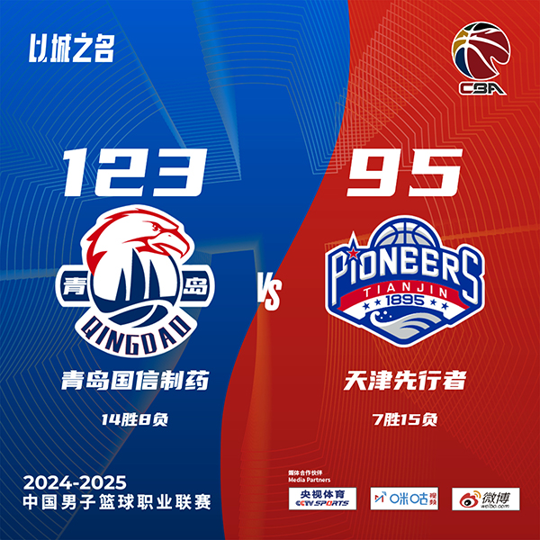 24直播网讯北京时间12月25日讯 CBA常规赛,青岛主场迎战天津。青岛13胜8负排联赛第八,天津7胜14负列联赛第十四。一开场,青岛率先发力,多点开花轰出17-3的开局,大卫-詹姆斯包揽球队开场15分苦苦追赶,次节青岛牢牢占据场上主动,韦瑟斯庞高效输出带队扩大优势,半场战罢青岛65-45领先天津20分。下半场,天津里突外投拿分缩小分差,青岛多点开花稳住局势,末节青岛稳扎稳打保持优势,天津大势已去无力回天。最终,青岛123-95轻取天津,主场过关。