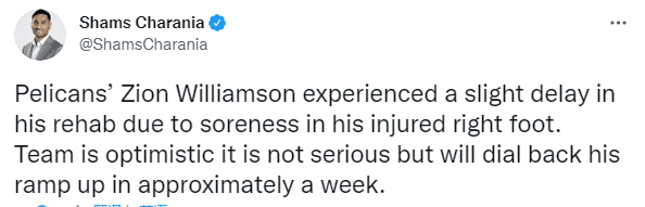 今年休赛期,锡安接受了足部手术,经过一段时间的康复,此前他已经获得允许参加全队训练,并且进行了4对4训练,可如今锡安的右脚出现酸痛的情况,因此他只能暂停训练,预计将在一周后恢复训练。