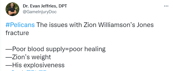 医学专家Evan Jeffries分析锡安的情况,锡安因足部骨折面临的问题,一是足部供血不足,相当于没有痊愈,二是锡安的体重问题,三是他的爆发力,这都是锡安复出面临的难题。