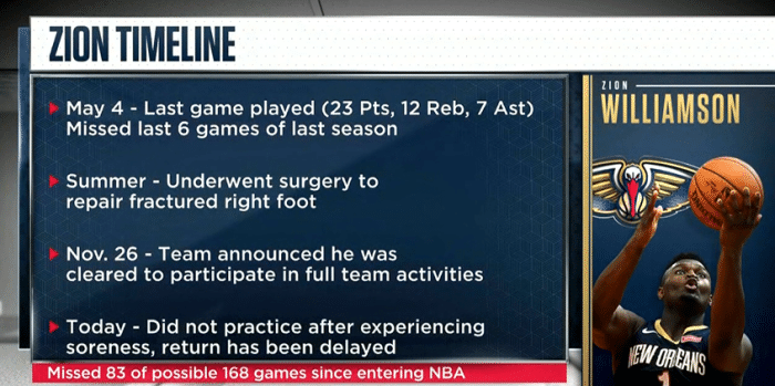 锡安受到右脚骨折伤势的困扰,而且他的体重又增加了不少,种种问题导致他被迫停止训练,因此推迟复出时间。