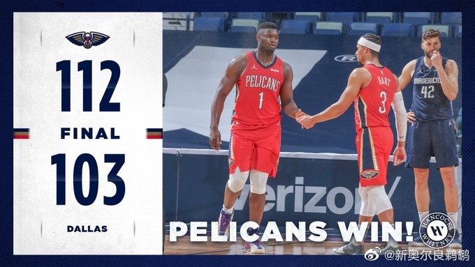 24直播网3月28日讯 NBA常规赛,鹈鹕主场迎战独行侠,两队上一场比赛都输给各自对手,前者目前排名西部第12位,后者目前排名西部第7位,本场比赛东契奇、波尔津吉斯都缺阵,鲍尔也是继续不打。开局上来两队就展开拉锯战,比分一直拉不开,末段鹈鹕一波13-0的进攻高潮建立15的领先优势进入次节,次节中段独行侠也打出一波17-0的攻击波直接反超比分,锡安连续冲击内线帮助鹈鹕打平独行侠进入下半场。易边再战,独行侠开局又打出小高潮取得领先,锡安和布莱德索连续得分抹平分差,依靠锡安连续突内线杀伤,鹈鹕只领先2分。末节双方还是展开胶着拉锯战,末段鹈鹕靠防守打出一波9-0一举奠定胜局,最终鹈鹕击退独行侠。