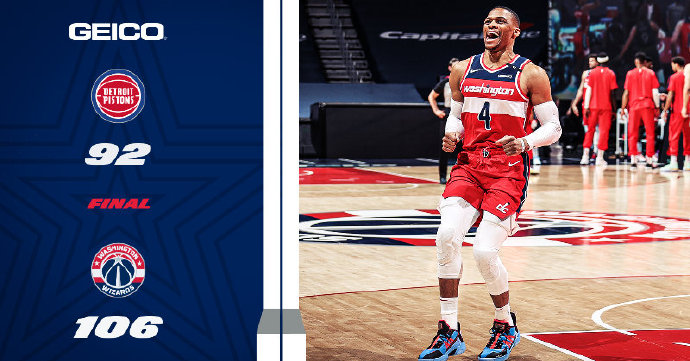 奇才(15-28):威少19分19篮板10助攻、比尔17分3篮板6助攻、莱恩12分1篮板、八村塁14分6篮板、加福德13分5篮板3盖帽、马修斯6分2篮板、阿夫迪亚5分5篮板2助攻2抢断,洛佩兹8分4篮板2助攻2盖帽、