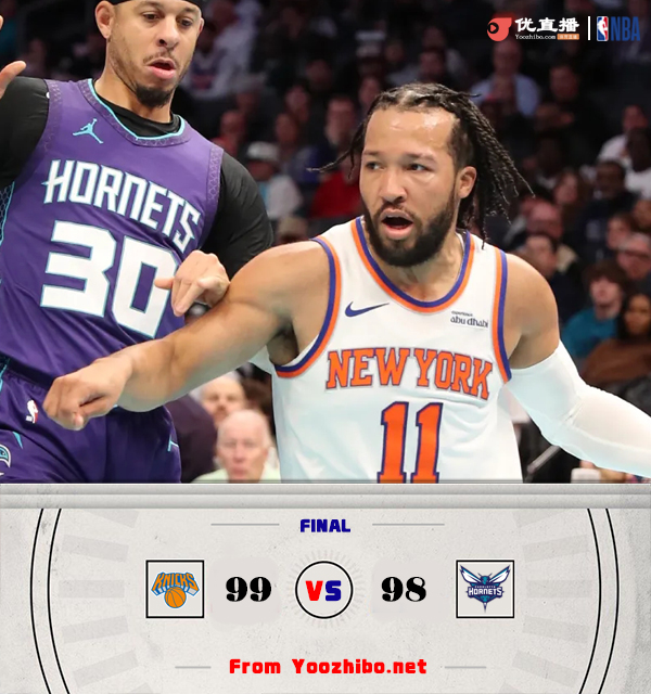 24直播网讯11月30日讯 NBA东部NBA杯A组,黄蜂主场迎战尼克斯。拉梅洛-鲍尔和迈尔斯-布里奇斯都不打。一开场,黄蜂率先发力,萨隆高效拿分带队取得领先,次节双方展开对攻,尼克斯火力更猛,唐斯和布伦森联手带队缩小分差,半场战罢尼克斯46-49落后黄蜂。下半场,两队继续缠斗,比分咬得很紧,末节双方争夺陷入白热化,布伦森稳定输出帮助尼克斯取得微弱优势,关键时刻马丁绝平三分不中,黄蜂苦苦追赶无果。最终,尼克斯99-98险胜黄蜂。