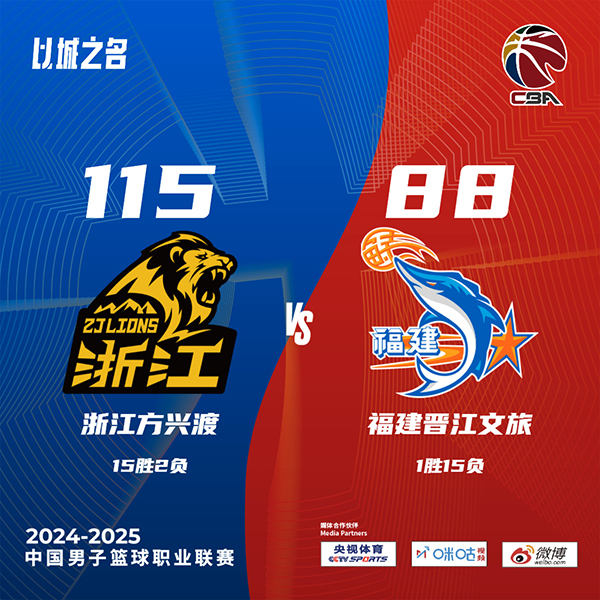 24直播网体育讯北京时间12月13日讯 CBA常规赛,广厦迎战福建。广厦14胜2负联赛榜首,福建1胜14负垫底。一开场,双方开场势均力敌,胡金秋独得9分,福建多点开花给出回应,双方比分交替领先,次节广厦开始发力,胡金秋内外开花,朱俊龙连中三分率队轰出19-4的攻击波取得20分的优势,半场战罢广厦领先福建。下半场,福建连投带罚努力缩小分差,广厦多点开花保持大比分的优势,末节广厦稳扎稳打保持优势,最终,广厦115-88大胜福建。