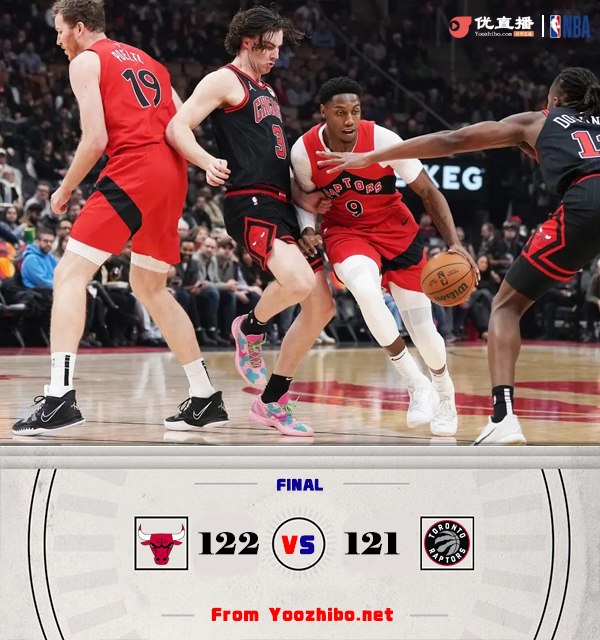24直播网讯北京时间12月17日讯 NBA常规赛,公牛对阵猛龙,公牛上场比赛击败黄蜂,猛龙最近遭遇4连败,本场比赛拉文缺阵。开场后猛龙抢占先机,但没有多久武切维奇和怀特就帮助公牛反超比分,随后公牛通过外线三分扩大优势。第二节,巴雷特和迪克轮番冲击内线帮助猛龙追分,不过公牛多点开花牢牢守住优势。易边再战,两队依旧是拉锯战,第三节后半段公牛轮换阵容全面开花将分差拉大到两位数,基迪受伤离场。第四节,猛龙后程发力,依靠迪克和阿巴基一路将比分追上,关键时刻鲍尔命中三分,猛龙始终差一口气。最终公牛122-121送给猛龙5连败。