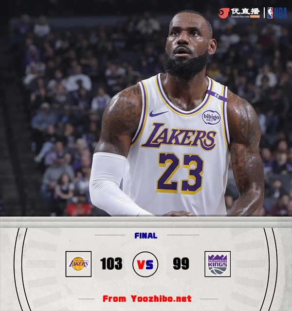 24直播网讯 北京时间12月22日讯 NBA常规赛,湖人客场挑战国王。湖人近期2连胜,以15胜12负排在西部第七,国王13胜15负暂列西部倒数第四。比赛开始,詹姆斯率先发力,连突带投单节独得12分率队取得领先,福克斯连投带罚帮助国王咬住比分,次节詹姆斯依旧神挡杀神,国王内外开花努力追赶,半场战罢湖人56-53领先国王。易边再战,双方陷入拉锯战,比分交替领先,末节湖人持续发力取得10分领先,福克斯和小萨联手拿分顽强咬住,关键时刻浓眉两罚不中,但八村塁拍出前场篮板后里夫斯两罚都有,湖人103-99险胜国王。