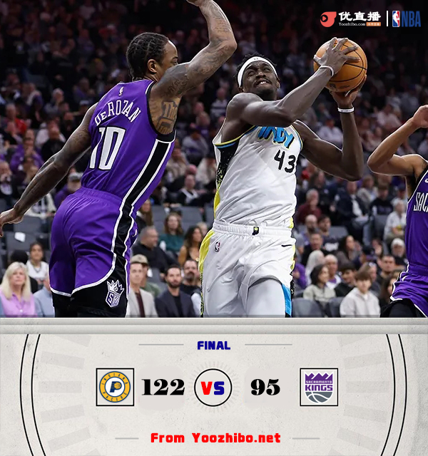 24直播网12月23日 NBA常规赛,国王主场迎战步行者。国王3连败排西部第十二,步行者3连胜列东部第八。比赛开始,双方开场势均力敌,比分交替领先,次节双方依旧打得难解难分,国王内外开花,步行者不断冲击内线拿分强势回应,两队你追我赶,半场战罢战成52平。易边再战,步行者持续发力,多点开花取得两位数领先,末节国王彻底断电,步行者轰出24-7将分差拉开到20分以上杀死比赛。最终,步行者122-95轻取国王,取得4连胜的同时送给国王4连败。