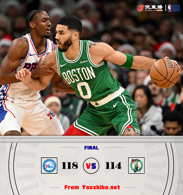 24直播网讯12月26日NBA圣诞大战,凯尔特人主场迎战76人,凯尔特人目前22胜7负高居东部次席,76人则是10胜17负排在东部第12位。本场比赛,霍勒迪缺阵。比赛开始,双方上来就下起三分雨,马克西里突外投迅速上双,恩比德接连内线强打建立主动权,但绿军依然靠三分回应,首节76人领先5分,次节双方再次三分对飚,马克西有攻有传带队15-2攻击波扩大到双位数领先,塔图姆里突外投连砍9分带队追分,恩比德接连中远投强势回应8分,半场76人还领先8分。下半场,双探花联手7-0追分,随后76人进攻端受阻,杰伦-布朗里突外投单节砍下14分助队直接反超比分,三节双方打成82平,末节马克西里突外投加助攻凯莱布-马丁三分,带领76人轰出18-2重新取得领先,塔图姆带队连续强杀回应11-0咬住比分,恩比德联手马克西止血,76人重新领先到两球以上,乔治和恩比德两罚全中杀死比赛,最终76人118-114力克凯尔特人。