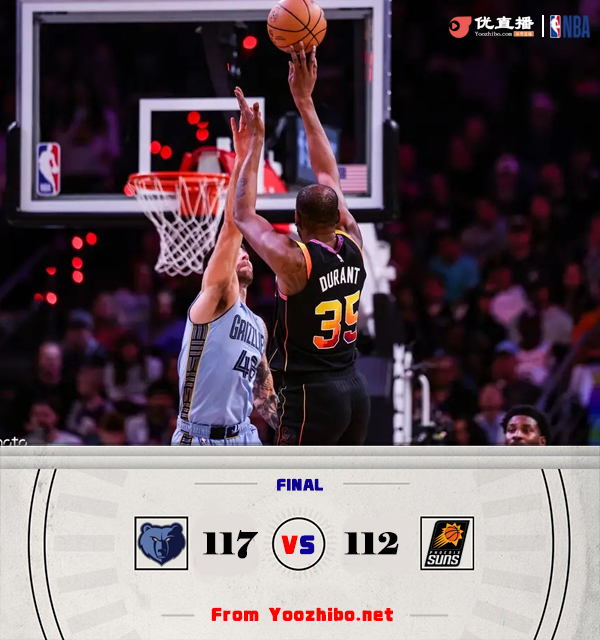 24直播网1月1日讯 NBA常规赛,灰熊对阵太阳。灰熊上场比赛大败给雷霆,本场比赛莫兰特继续缺阵,太阳最近遭遇2连败,本场比赛布克复出。开场后贾伦-杰克逊连续强攻得手帮助灰熊以11-2开局,虽然太阳进攻逐渐找到感觉,但贾伦-杰克逊完全打爆太阳内线,他首节独得19分带领灰熊建立起10分优势。第二节上来太阳一波7-0的反扑迫近比分,这次换到贝恩站出来,他外线连中三分独得10分帮助灰熊稳住阵脚,两队陷入拉锯战,比尔受伤离场。易边再战,太阳多点开花一路追到只差2分,但随后他们自己连续出现失误又被灰熊将比分拉开,太阳多次努力追分,但始终差一口气未能将比分追上,康查尔跑篮下空位打成2+1,杜兰特强攻不中,最终灰熊117-112送太阳3连败。