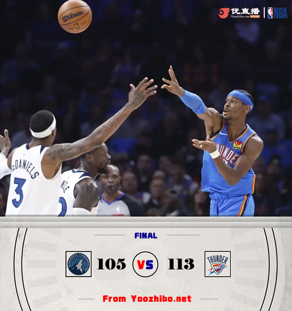 24直播网1月1日讯 NBA常规赛继续进行,西部头名雷霆与森林狼迎来青春对话,雷霆豪取11连胜,26胜5负稳居西部榜首,森林狼近期迎来三连胜,17胜14负位列西部第8位。首节开打后双方早早进入状态,兰德尔和康利外线发炮,里德内线不断取分,亚历山大单节10分及时回应,首节结束时森林狼领先3分,次节回来,开局阶段雷霆继续紧咬比分,但中段雷霆进攻出现停滞,爱德华兹飚中3记三分率队稍稍拉开比分,半场战罢,森林狼确立6分优势。短暂休整后雷霆及时复苏,连中三分回敬13-0进攻高潮一举反超,末段森林狼进攻依然没有起色,亚历山大则予取予求单节狂揽19分,雷霆带着14分优势进入末节,末节上来,森林狼找回进攻感觉不断蚕食分差,但亚历山大飚中关键三分,雷霆顶住对手反扑,最终雷霆113-105击败森林狼迎来12连胜。