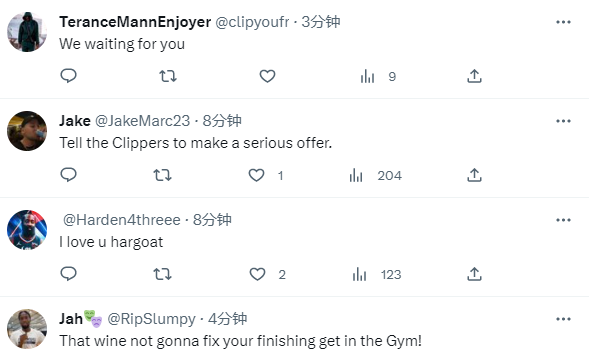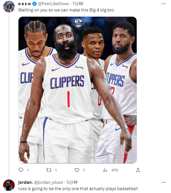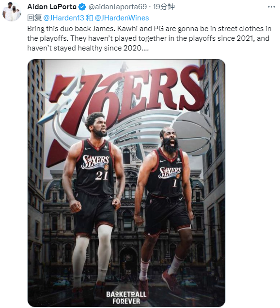 76人记者AidanLaPorta也劝哈登留下来,表示:小卡和乔治将在季后赛身穿便装观战,自从2021年以来,他们就没有一起打过季后赛,自从2020年以来,他们就没都保持健康过。