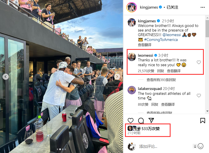 詹姆斯欢迎梅西的动态引热议,这条帖子在发布仅20小时后就得到了超过500万次点赞,这是詹姆斯自从2020年后点赞数最多的Ins帖子。