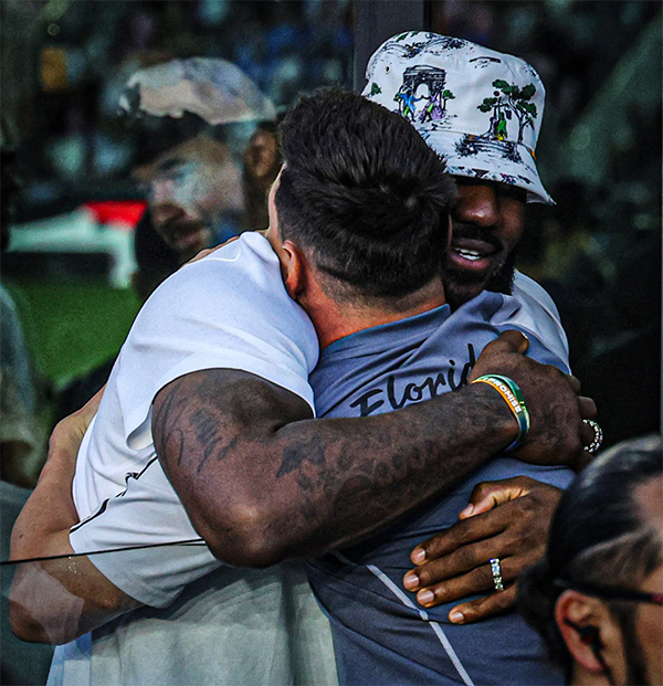 梅西首秀赛前,詹姆斯和梅西深情拥抱以及热聊;梅西绝杀后,詹姆斯发推直言:难以置信;詹姆斯还在Ins上晒拥抱梅西的合影,写道:欢迎兄弟!总是很高兴能看到并与传奇在一起。