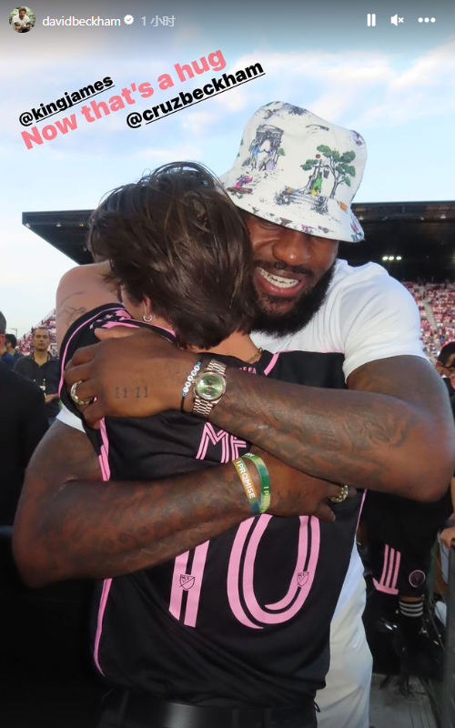 足坛名宿大卫-贝克汉姆也晒出与詹姆斯以及其他人的合影,还转发了一张詹姆斯拥抱他的儿子克鲁兹的合影,写道:詹姆斯那才叫拥抱呢。