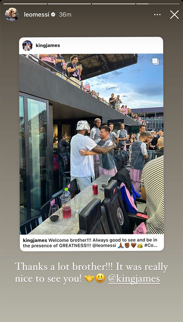 梅西不仅在詹姆斯动态的评论区留言,而且转发老詹的帖子,并配文写道:非常感谢你,兄弟!很高兴见到你。