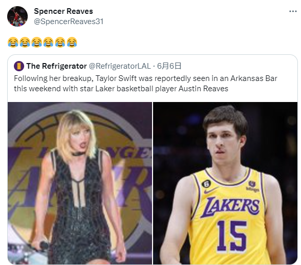 据此前美媒报道,湖人球员里夫斯曾与美国巨星泰勒-斯威夫特(别名霉霉)出现在同一家酒吧中,当时两人被曝正在约会引热议,对于此事,里夫斯的哥哥第一时间为弟弟辟谣,先是晒出一系列笑哭的表情,之后发推写道:奥斯汀去酒吧是这件事情中最不现实的部分。