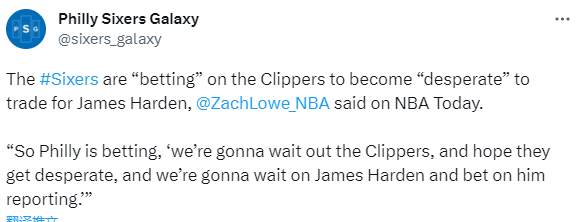 哈登不仅申请离队而且指定要加盟快船,他的团队相信自己最终能加盟快船,不过快船仅仅只愿意用到期合同进行交易,拒绝交易优质年轻球员和选秀权,76人对哈登的要价很高,因此双方谈判陷入停滞;对于哈登交易的情况,名记Zach Lowe表示:费城现在就是在赌:‘我们就是等,等到快船绝望,我们也会等哈登,赌他会来球队报到。