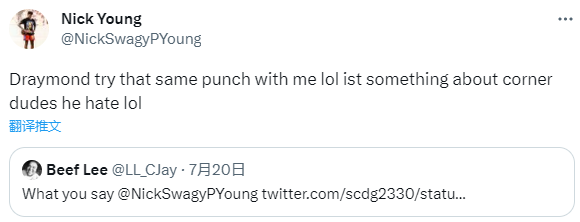 网友晒出尼克斯和追梦的视频并写道:这你怎么说?@尼克-杨;尼克-杨回复:追梦也给我来了同样的一拳,哈哈,他最烦那些底角球员了,哈哈。