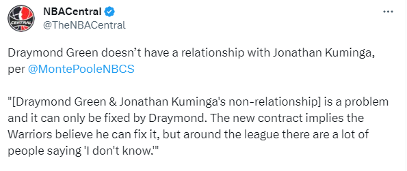 现在勇士更衣室又有了新的隐患,名记Monte Poole报道,德拉蒙德-格林和库明加之间无关系是球队的一个问题,只有德拉蒙德才能解决,新合同意味着勇士队相信他能解决这个问题,但全联盟很多人说‘我不知道’。