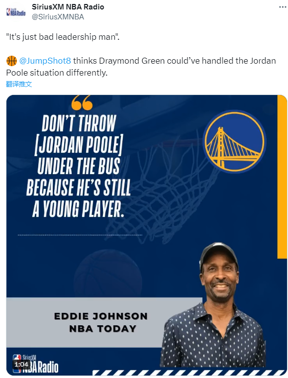 格林拳击普尔事件再引热议,前NBA最佳第六人埃迪-约翰逊在节目中谈及此事,表示:格林应该为自己的行为承担责任,普尔对于格林来说还是个小老弟,所以追梦的职责就是要让他变得成熟,但是追梦不知道如何帮助他成熟。不要因为普尔还是一名年轻球员就将他放在媒体的曝光下,这只能说明追梦的领导力很糟。