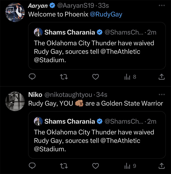 24直播网讯07月20日据名记shams报道,雷霆已经裁掉了老将鲁迪-盖伊,盖伊暂时失业,太阳和勇士球迷都招募他,据此前报道,勇士有意引援他。