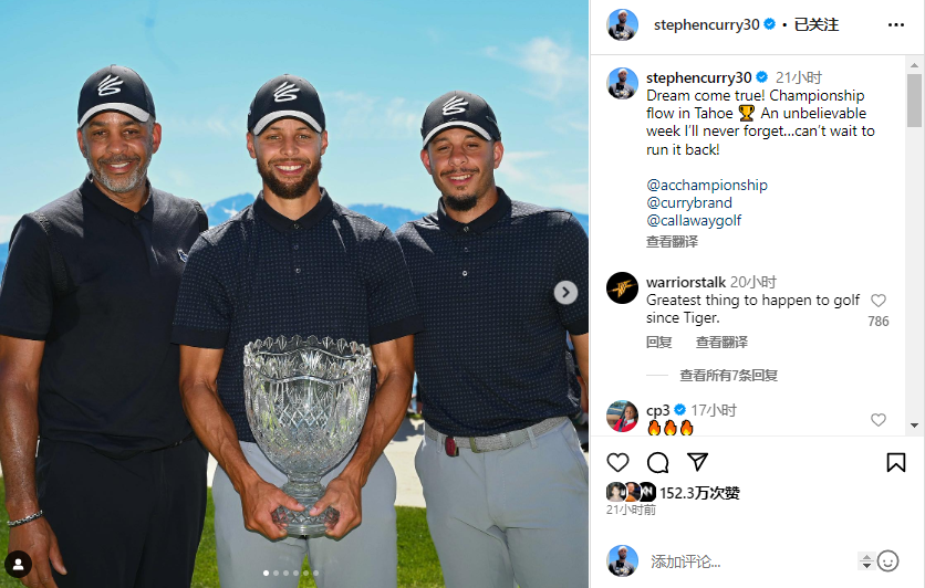 库里夺得高尔夫冠军后十分兴奋,一路奔袭以及振臂高呼,拥抱爱妻阿耶莎以及亲吻儿子卡侬和奖杯,激情之情持续了很久;之后库里在社媒上晒父子三人合影以及亲吻奖杯的画面,配文写道:梦想成真,令人难以置信的一周,我永远不会忘记,迫不及待地想重新开始!