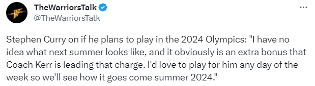 近日库里谈到他是否为美国男篮出战2024年奥运会,表示:我不知道明年夏天会是什么样子,科尔教练领导美国队显然是一个额外的奖励。我很想在一周中的任何一天为他打球,所以我们将看看2024年夏天的情况。