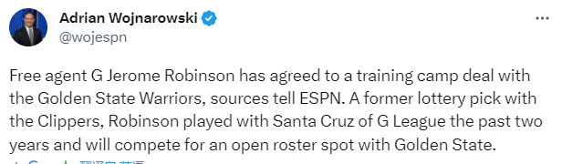 24直播网讯07月18日,据espn名记woj报道,NBA自由球员杰罗姆-罗宾逊已同意与金州勇士队达成训练营协议,他将争夺勇士队的一个空缺名额;罗宾逊曾是快船队的乐透秀,过去两年效力于勇士发展联盟的圣克鲁兹队。