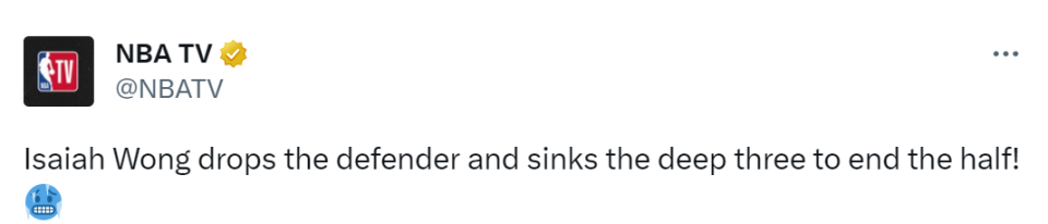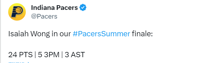 王在本场比赛中最惊艳的一个进球,是在半场结束前。他运球到前场,晃倒对方球员后,压哨三分出手命中!步行者官方晒出这一球后,写道:“以赛亚-王把他们晃飞了,然后打进了压哨球!”这一球也在NBA TV网站上转发。