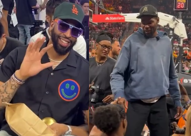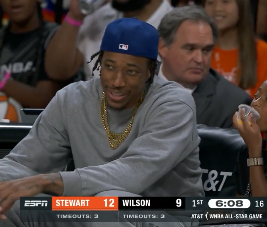 WNBA全明星正赛,阿贾-威尔逊队对阵布莉安娜-斯图尔特队,NBA多名现役球星现身,杜兰特身穿连帽卫衣来到现场,和明尼苏达山猫队球员西尔维娅-福尔斯拥抱,然后坐在场边观战。