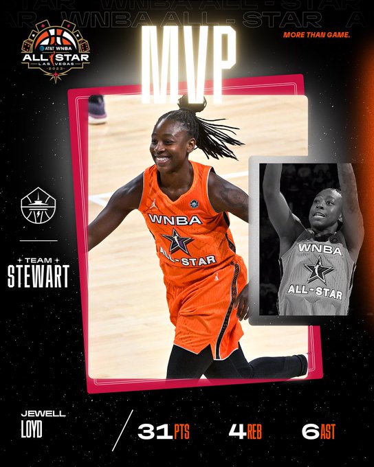 斯图尔特队获胜,朱厄尔-劳埃德凭借出色的表现获得2023年WNBA 全明星赛MVP,全场22投10中、三分球21中10轰下31分6助攻4篮板,单场命中10记三分创WNBA全明星赛历史纪录。