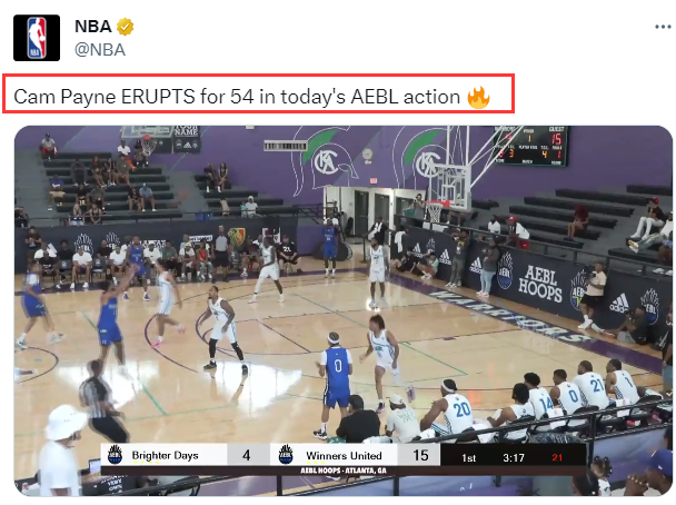 在AEBL业余联赛中(欧文曾参加过该联赛的比赛),佩恩的手感十分火热,第一节抢断反击上篮以及轰进不讲理超远三分,次节无视防守命中三分;下半场佩恩继续远投三分,末节关键时刻连中三分,带队轻松拿下比赛;佩恩全场轰下54分,NBA官方晒其集锦。