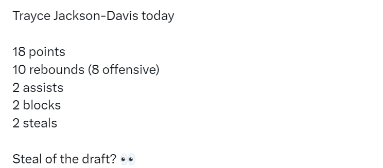 杰克逊-戴维斯因伤缺席了拉斯维加斯夏联的前3场比赛,但打了后两场。对火箭一战,成为他的首秀,他在20分钟内得到14分7篮板,投篮9中6,7个篮板中有4个是前场篮板。而这场对猛龙的比赛,他的表现再次升级。10个篮板中有8个是前场篮板,他对前板的嗅觉,实在出色。
