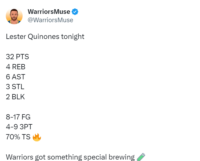 对猛龙这场比赛,奎诺内斯可谓是攻守俱佳,不但得到32分,而且贡献了3抢断2盖帽。奎诺内斯目前是双向合同受限自由球员,如此出色的夏联发挥,预计会让他有望成为常规阵容的一员。勇士目前的常规阵容名单已经达到13人,他们理论上还能签两位球员,但考虑到灵活性和薪金状况,应该最有可能先签一人。