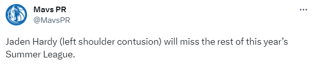 独行侠官方宣布,球队后卫杰登-哈迪因左肩挫伤,将缺席夏季联赛的剩余比赛;杰登-哈迪为独行侠出战了3场夏季联赛,场均得到23分5.3篮板2.6助攻。