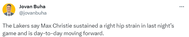 据湖人记者Jovan Buha报道,湖人官方表示克里斯蒂在昨天的比赛中拉伤了右髋,已经进入每日伤病观察名单;根据赛程,7月15日湖人将对阵灰熊,克里斯蒂可能因伤缺席比赛,而且他已经不需要通过夏联证明自己了。