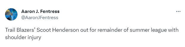 据开拓者随队记者Aaron J.Fentress报道,开拓者探花秀斯库特-亨德森因右肩拉伤将缺席夏季联赛的剩余比赛;在此前与火箭的比赛中,亨德森不幸拉伤肩膀而提前退出比赛,仅出战1场就退出夏联;夏联首秀出战21分钟,13投5中拿到15分5篮板6助攻1抢断。