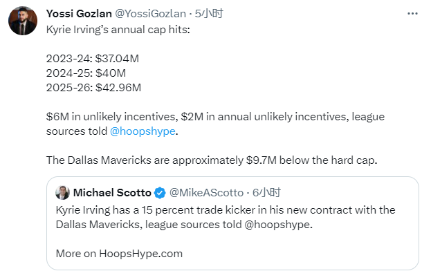 此前独行侠已经官宣和欧文续约,据悉双方签下3年1.26亿美元的续约合同。