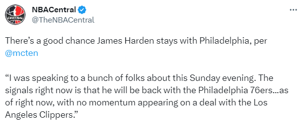 Dave McMenamin则透露,现在的迹象表明哈登将回到76人队,76人与快船队的交易还没有出现任何势头,看起来,他新赛季很可能回到76人队。