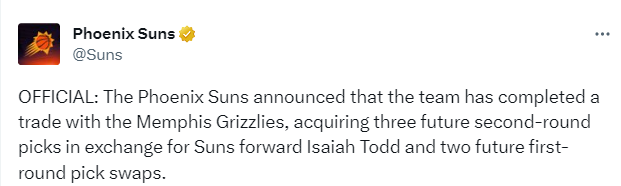 太阳和灰熊3换3交易详情——太阳将以赛亚-托德和两个未来首轮互换权(2024年和2030年)送到灰熊,得到三个未来次轮签(2025年来自鹈鹕、2028年和2029年来自灰熊)。