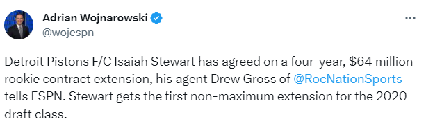 24直播网讯07月11日据espn名记woj报道,活塞已经和以赛亚-斯图尔特达成一份4年6400万美元的续约合同,斯图尔特成为2020届新秀众第一个非顶薪提前续约合同的球员;斯图尔特曾和詹姆斯发生冲突,因追打詹姆斯被联盟禁赛2场比赛。