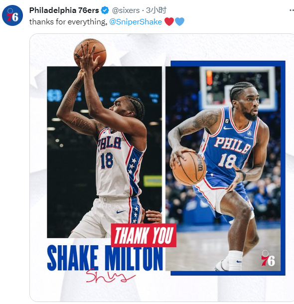 76人官方还告别米尔顿,感谢你所做的一切。
