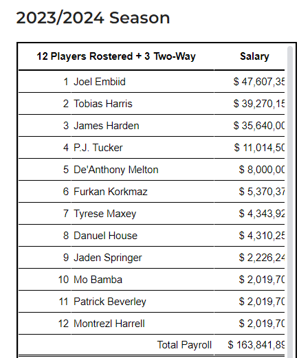 12保障合同球员——恩比德、哈里斯、哈登、PJ-塔克、梅尔顿、科尔克马兹、马克西、豪斯、杰登·斯普林格、班巴、贝弗利和哈雷尔;13人年薪加起来高达1.638亿美元,其中恩比德年薪4760万美元,哈里斯3927万美元和哈登3560万美元。