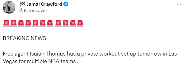 24直播网讯07月10日,前NBA超级第六人贾马尔-克劳福德透露,自由球员以赛亚-托马斯明天将在拉斯维加斯为多支NBA球队试训,很明显,34岁小刺客仍旧想要重返NBA。