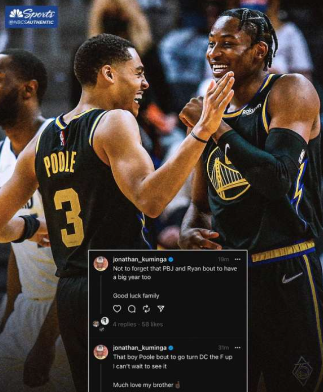勇士球员库明加在Threads上告别前队友,表示:普尔将引爆DC(华盛顿),我迫不及待想看到这一幕了!爱你,我的兄弟。别忘了PBJ(帕特里克-鲍德温)和Ryan(莱恩-罗林斯)也将迎来一个重要的一年。祝好运家人们。