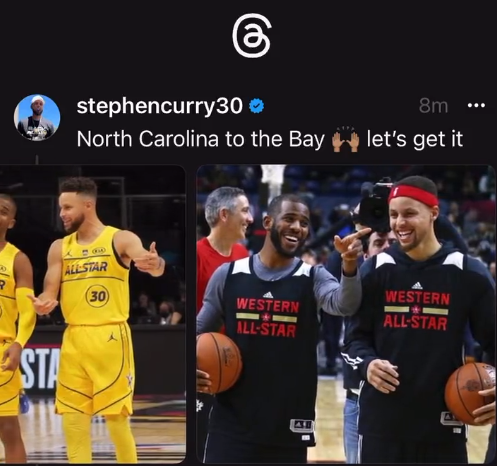 库里还在Threads上晒出昔日与保罗在全明星赛场上的合影,欢迎保罗加盟勇士。