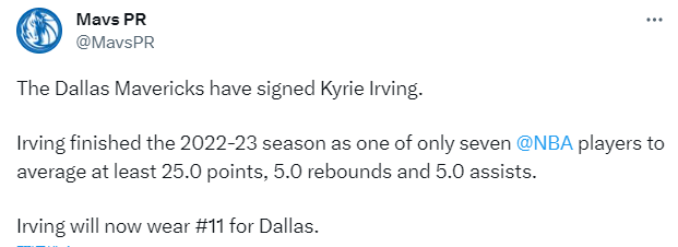 24直播网讯07月08日,达拉斯独行侠官方正式宣布与欧文续约,并且宣布欧文新赛季将改穿球队的11号球衣;新赛季,欧文继续联手东契奇冲击总冠军。