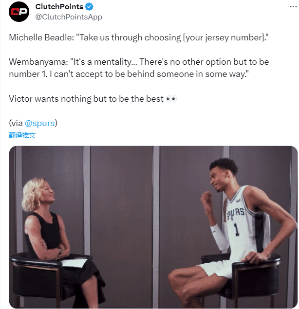 文班亚马登陆NBA后为何选择马刺1号球衣,文班本人回应:这是一种心态,1号对我来说意味着成为第1,我不能接受落后于其他人,我是最好的。
